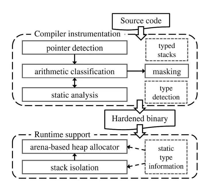 In this paper, we propose Type-based Data Isolation (TDI), a new practical design point in the data isolation space to mitigate info leaks. TDI isolates memory objects of different colors in separate memory arenas and uses efficient compiler instrumentation to constrain loads to the arena of the intended color by construction. TDI’s arena-based design moves the instrumentation from loads to pointer arithmetic operations, enabling new aggressive speculation-aware performance optimizations and eliminating the need for points-to analysis. Moreover, TDI’s color management is flexible. TDI can support a few-color scheme with sensitive data annotations similar to prior work (e.g., 2 colors) or a many-color scheme based on basic type analysis (i.e., one color per object type). The latter approach provides fine-grained data isolation, eliminates the need for annotations, and enforces strong color-matching invariants equivalent to ideal (context-sensitive) type-based points-to analysis. Our results show that TDI can efficiently support such strong security invariants, at average performance overheads of <10% on SPEC CPU2006 and nginx.